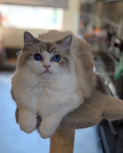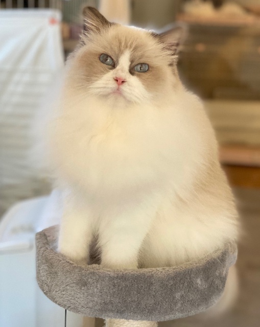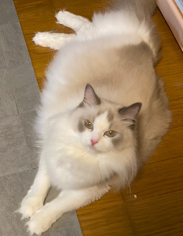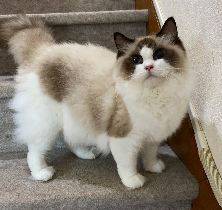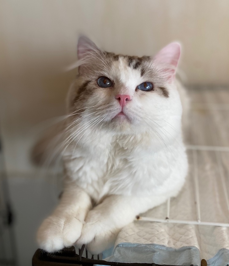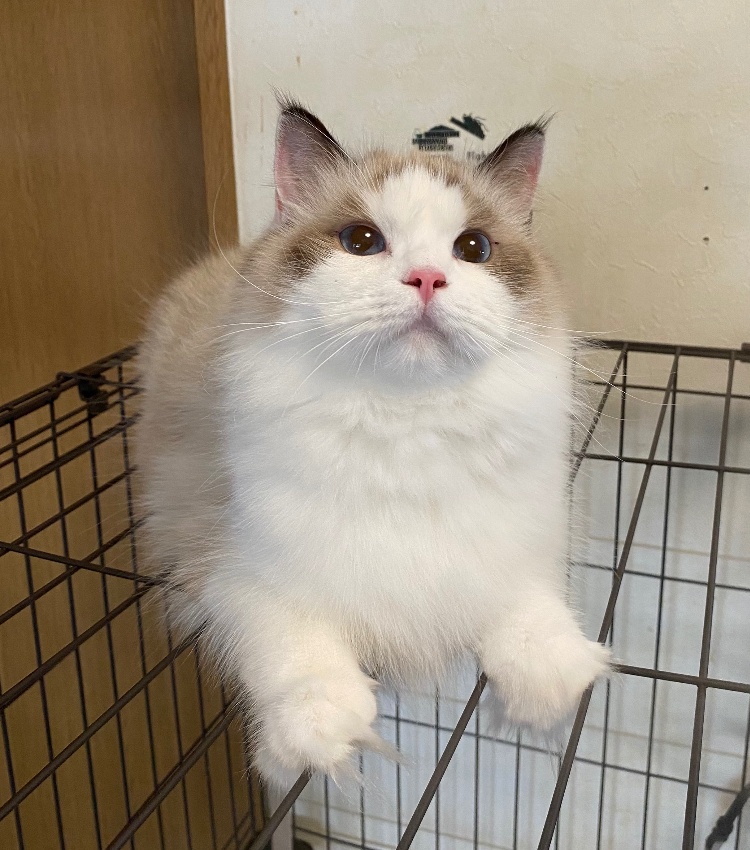 【ラグドール】20210328生まれブルーポイントバイカラー男の子出会った瞬間からゴロゴロが止まらなかったので、そこからゴロウになりました成長と共に収まるかと思いきや、ゴロゴロ音まで大きく成長(笑)穏やかで我が家イチの食いしん坊!とにかくごはんを一番に食べたいので、ごはんをあげるまでずーーーっと付き纏ってきます😂ACCダブルチャンピオン遺伝子検査クリア(HCM・PKD・PK欠損症)フードニュートロナチュラルチョイスアダルトチキンママクックムネ肉ふりかけ※引退しました