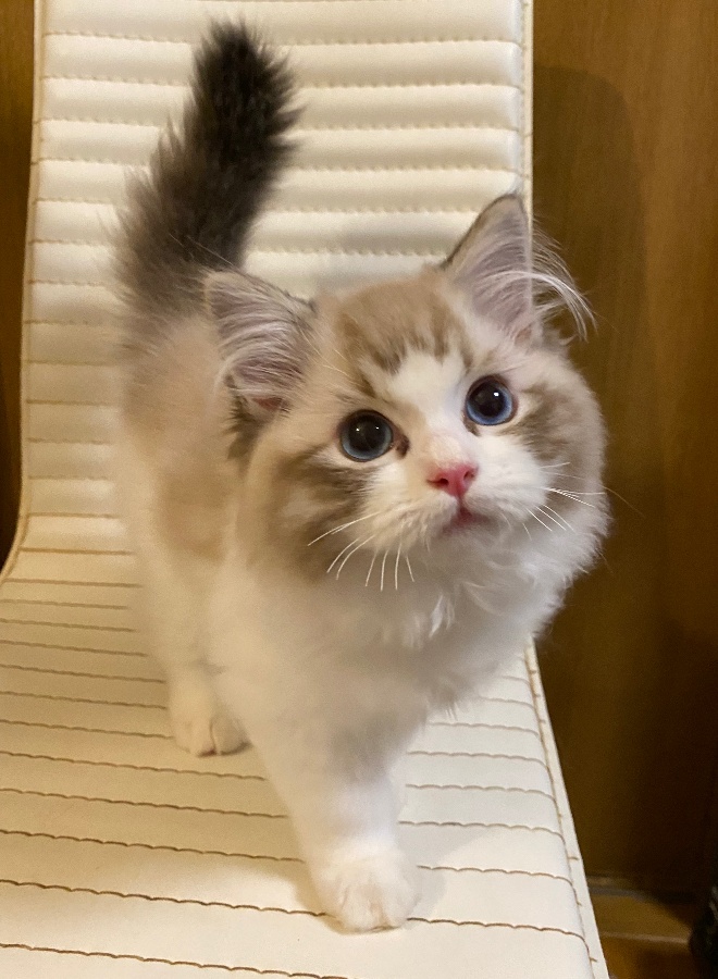 【ラグドール】20220904生まれシールリンクスポイントバイカラー女の子カムイと小紫の娘愛称イコちゃんツンデレガールツンの時は素っ気ないのですが、一度デレに入るとデレデレ具合が凄過ぎてたまらく可愛いのですそんなイコロに振り回される日々です遺伝子検査クリア(HCM)