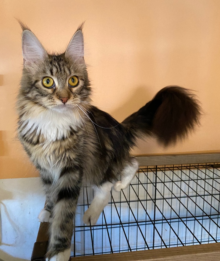 【メインクーン】20210122生まれブラウンクラッシックタビー&ホワイト男の子愛称そーちゃんとっても無邪気な子遊ぶのも抱っこも大好き✨ワンちゃんのようにペロペロしてきます今は漢に目覚め…看板猫を辞め自宅で女の子の部屋で過ごしています男の子が苦手で、女の子の部屋で過ごしておりますが、うっかり男の子が侵入すると、体を出来るだけ小さくしてサイレンのような鳴き声を上げますCHUBBY CATではそれをSOLセキュリティーと呼んでいます笑ACCチャンピオン遺伝子検査クリア(HCM・PKD・PK欠損症)